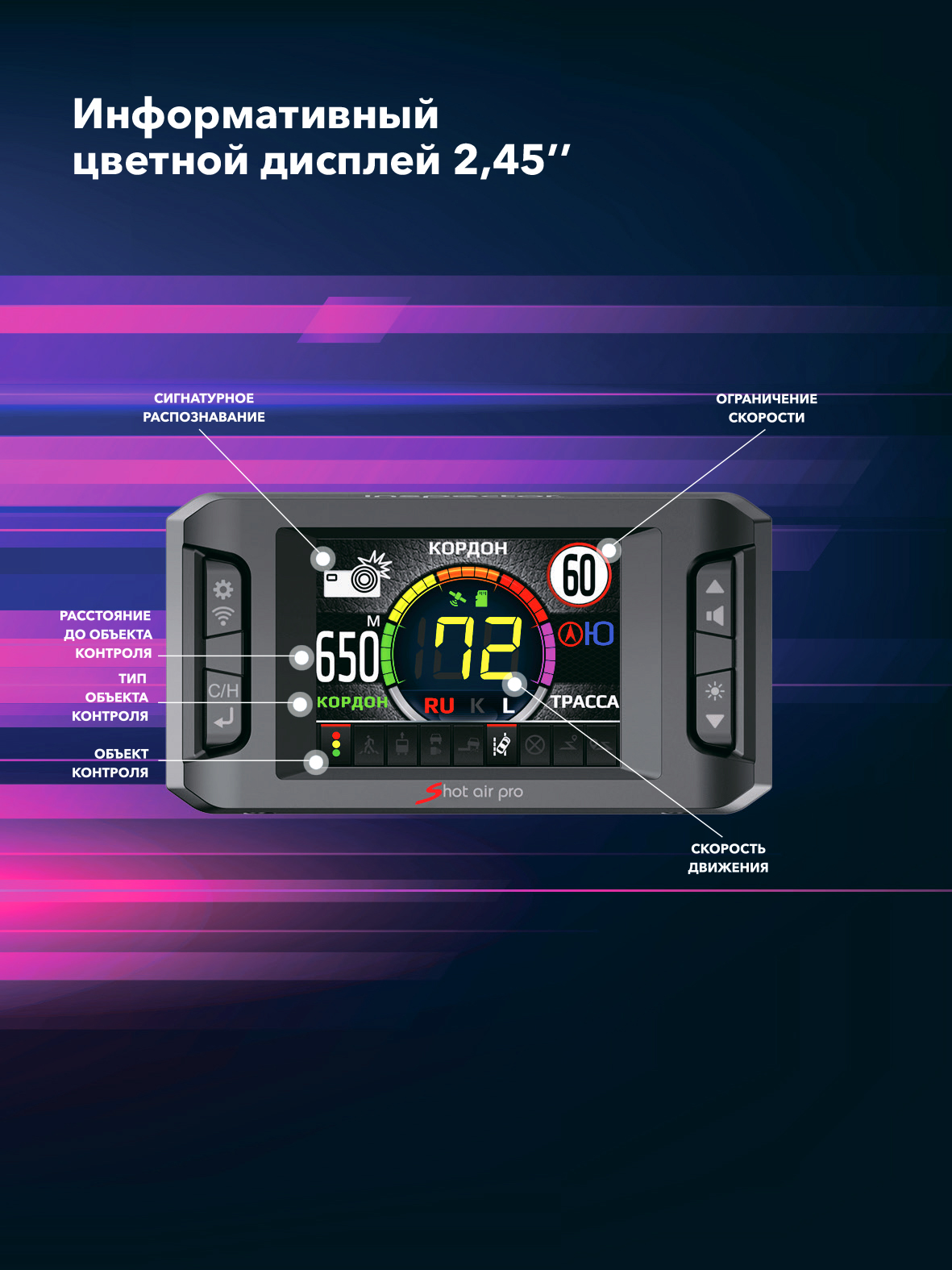 - Полноцветный ЖК-экран с диагональю 2" высокого разрешения позволяет комфортно разместить на экране большой объем информации по сравнению с однострочными OLED-дисплеями в классических радар-детекторах;