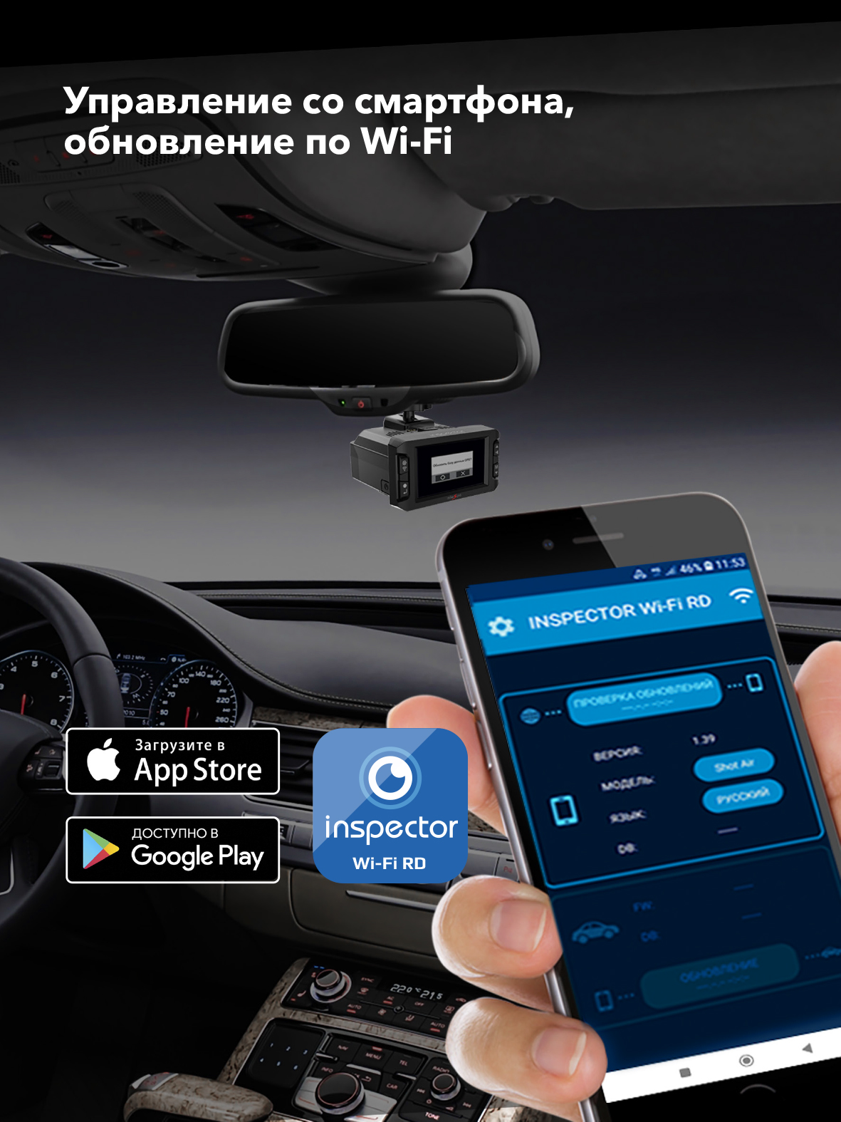 - Встроенный Wi-Fi модуль позволяет установить связь со смартфоном на базе Android или с iPhone, чтобы с помощью официального приложения иметь возможность обновить базу радаров и камер, не выходя из автомобиля. Помимо этого приложение позволяет внести изменения в настройки устройства.
