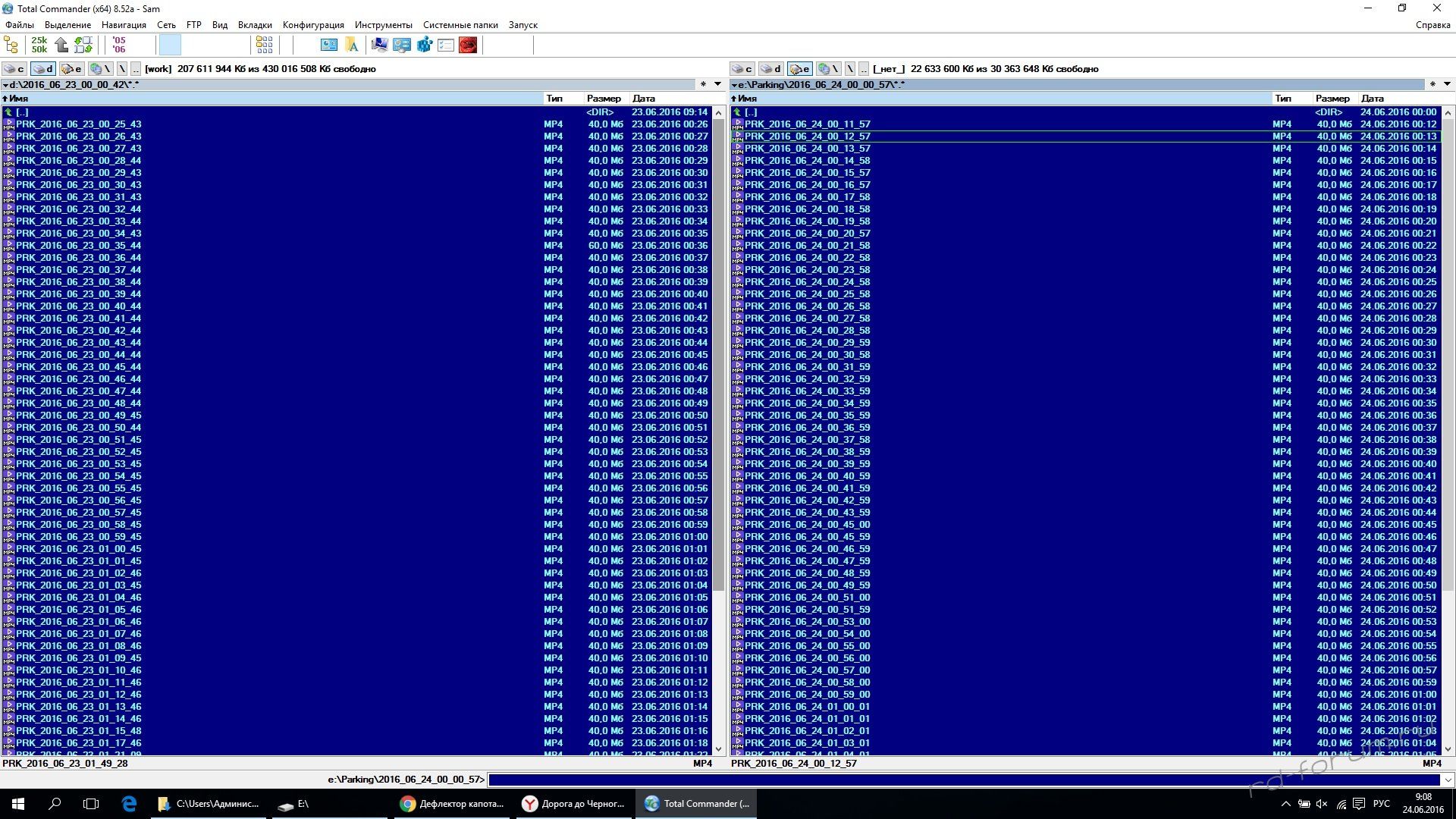 Добрый день! Написал вопрос на другом портале такое же, но спрошу еще здесь. Являюсь обладателем данного девайса не так давно, про радарную часть сказать пока ни чего не могу, не удалось проверить, видеорегистраторная устраивает. Для уменьшения ряби изображения, в настройках видео установил разрешение 720р. Вопрос в другом. 9700 подключен к бортовой сети через 3-pin кабель и работает в режиме парковки. Почему то каждую ночь начиная приблизительно с 00:15 регистратор пишет файлы каждую минуту в течении 1-2 часов. При просмотре видео события отсутствуют. На всех видео в течении этого времени. Дальше, после 2х часов ночи идут уже нормальные файлы с событиями (проехала машина, пролетела птица и т.д.) Прикладываю два скриншота перечня файлов открытых в Тотал командоре (за 23 и 24 число) и на них видно время. А так же попробую приложить файлы без событий. Что может быть ? Оно вроде как не мешает, но память отведённую забивает.