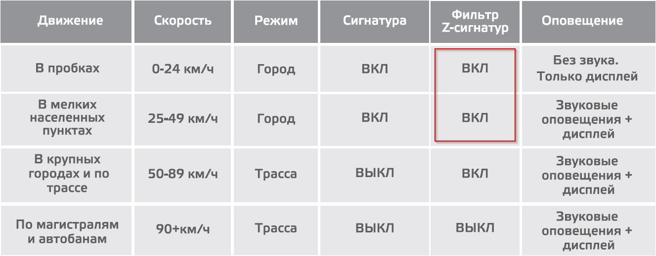 2. Добавлено сигнатурное распознавание сигналов в режиме «Трасса» и режиме «Х-СОР» при скорости выше 75 км/ч.