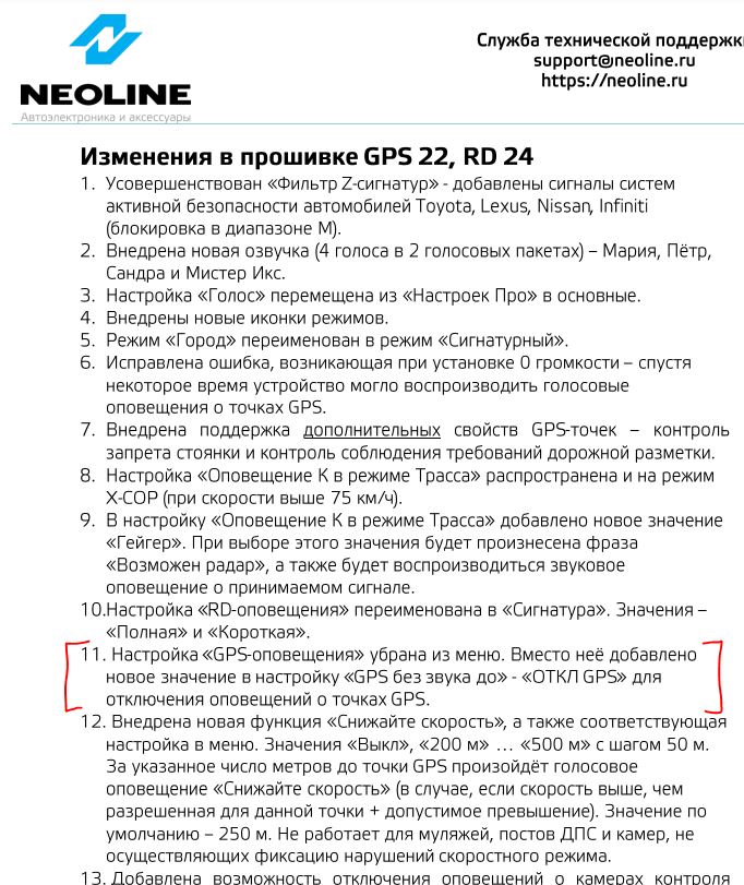 14. Исправлена ошибка работы устройства при превышении скоростного режима перед GPS-точкой в условиях, когда установлены несколько точек подряд. Второе и последующие GPS-оповещения могли происходить с увеличенной громкостью.