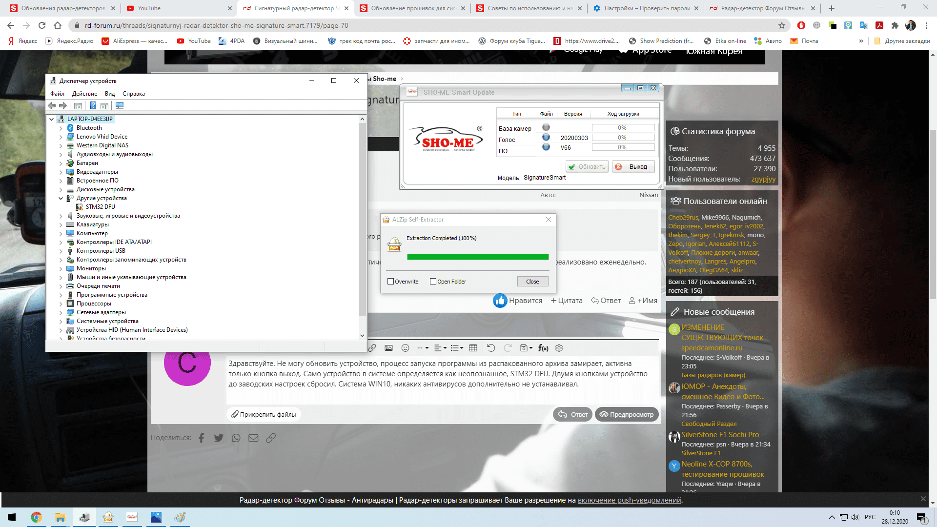 Здравствуйте! Драйвер установили?Здравствуйте. Не могу обновить устройство, процесс запуска программы из распакованного архива замирает, активна только кнопка выход. Само устройство в системе определяется как неопознанное, STM32 DFU. Двумя кнопками устройство до заводских настроек сбросил. Система WIN10, никаких антивирусов дополнительно не устанавливал. Посмотреть вложение 68420 Посмотреть вложение 68420