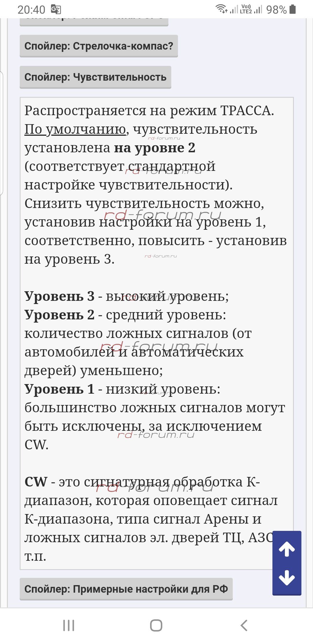Чувствительность - 3 (макс), 2 (сред), 1 (низкая) на усмотрение, распространяется на режим ТРАССА.
